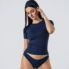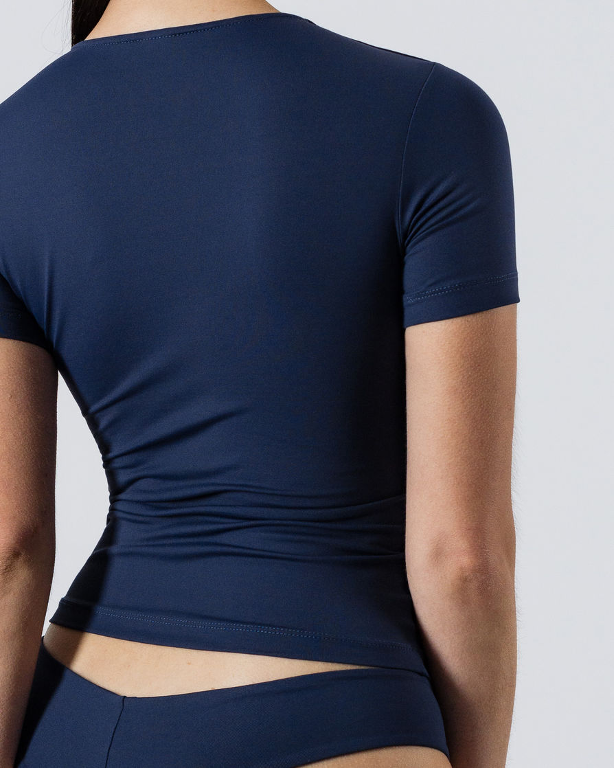 Camiseta cuello redondo, manga corta con forro interior hasta debajo del busto. De silueta perfecta, stretchy. Prenda de alta calidad confeccionada en lycra brasilera. Propiedades: